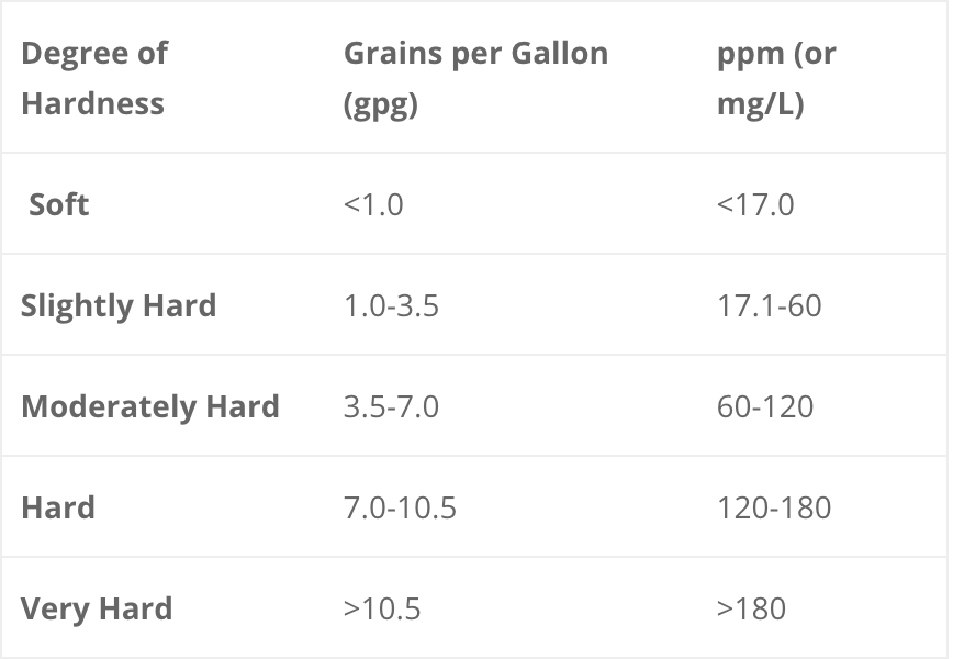 The hardness of any given water is determined by the amount of dissolved substances in it. This table, from the American Society of Agricultural Engineers (S-339) and the Water Quality Association (WQA), lists the typical measurements of hardness: